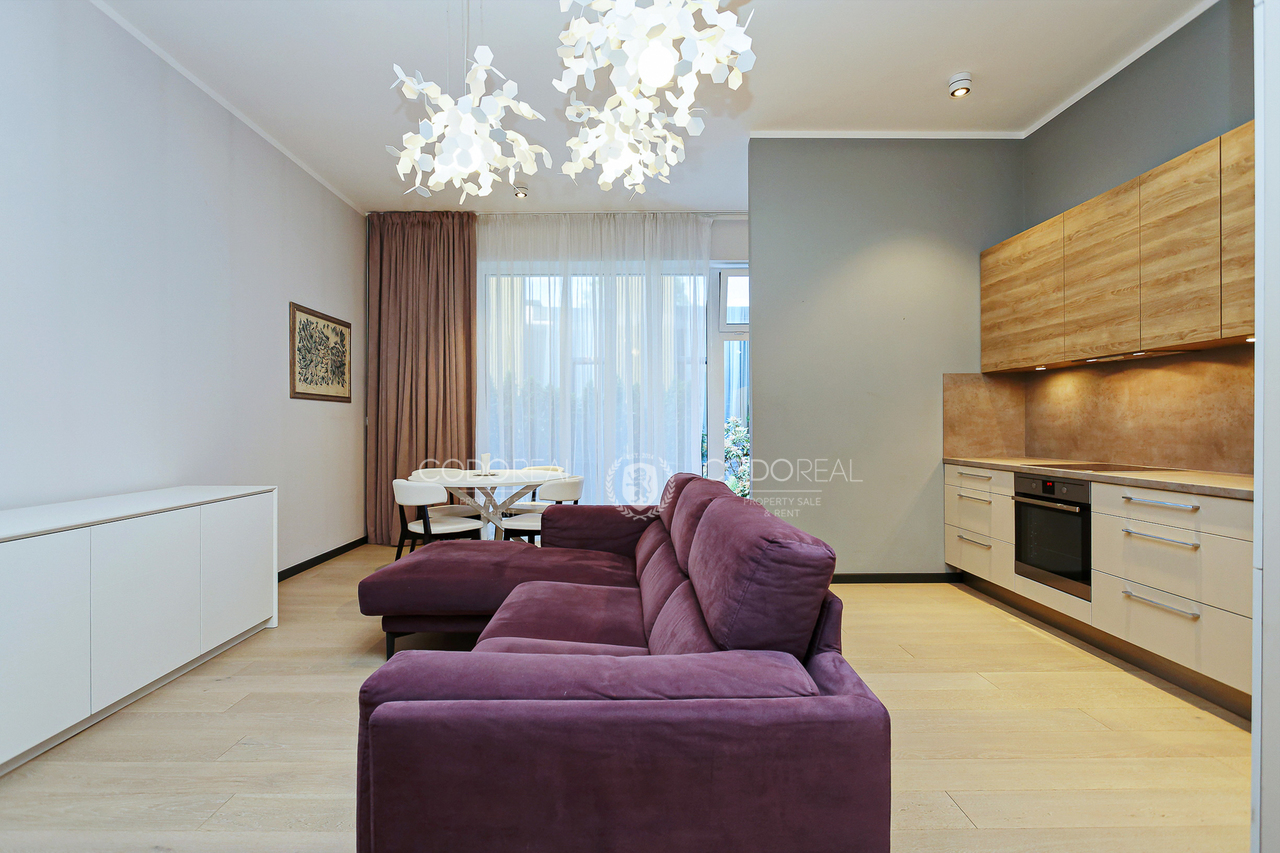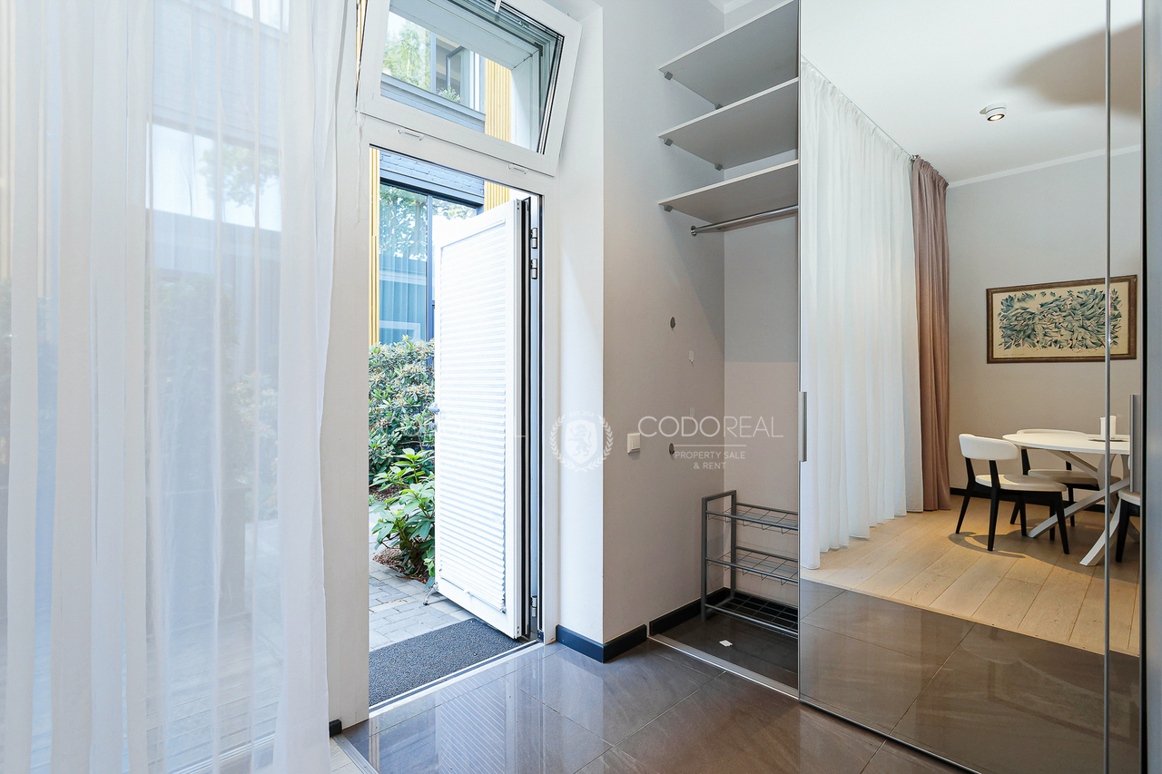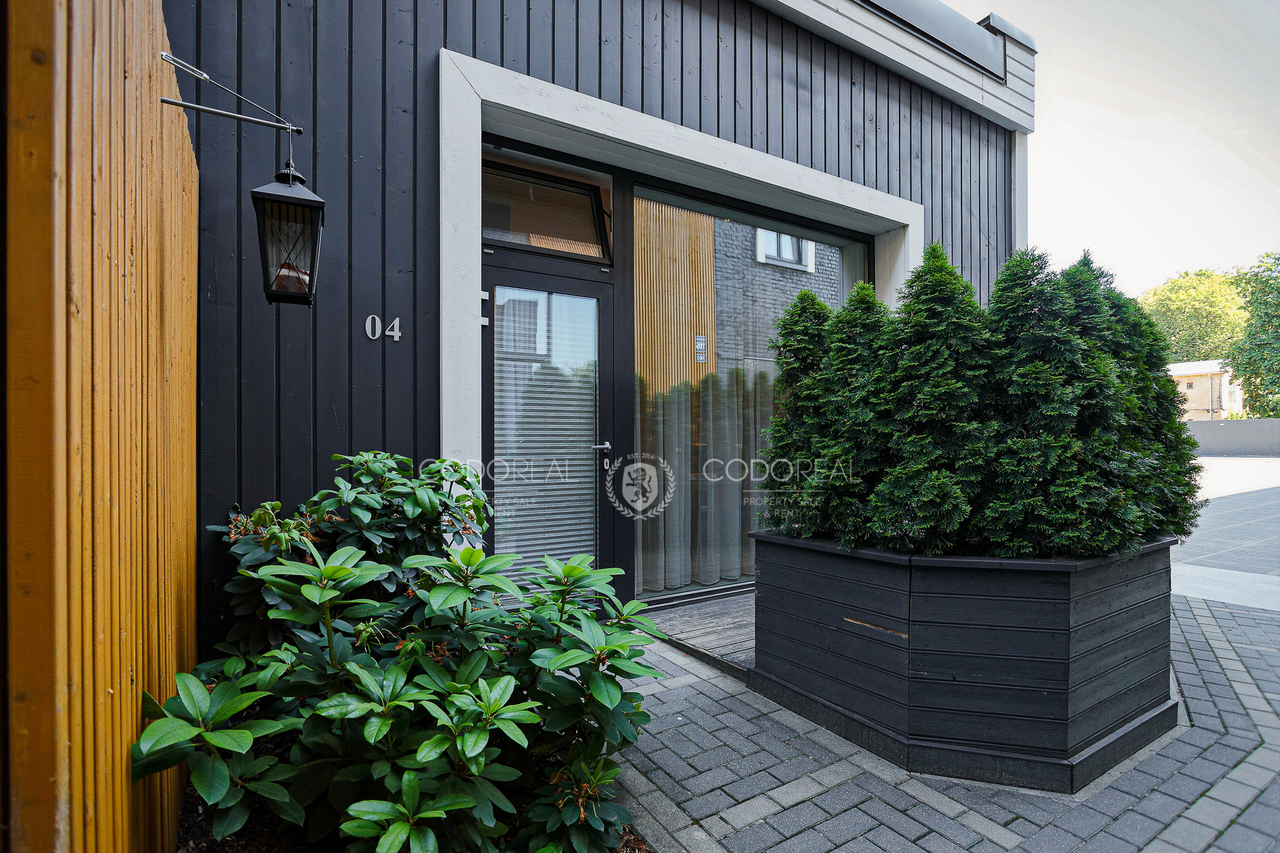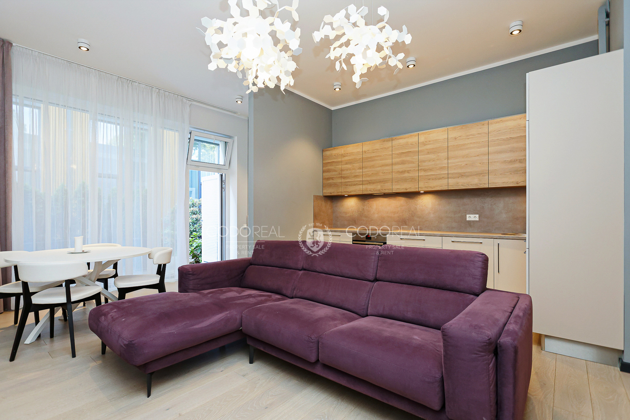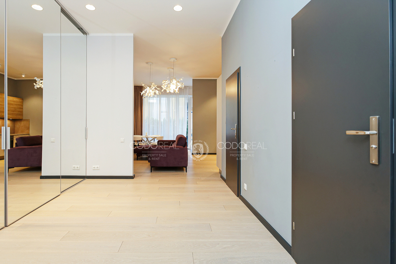 We offer to rent a 3-room apartment in Agenskalns, in the residential complex "Kalnciems Quarter Residences". The apartment is located in a separate one-storey building, with a private entrance and a small outdoor terrace. What makes the apartment special is the interior and layout created by the designer, with his vision of city life. The price will include one surface parking space.