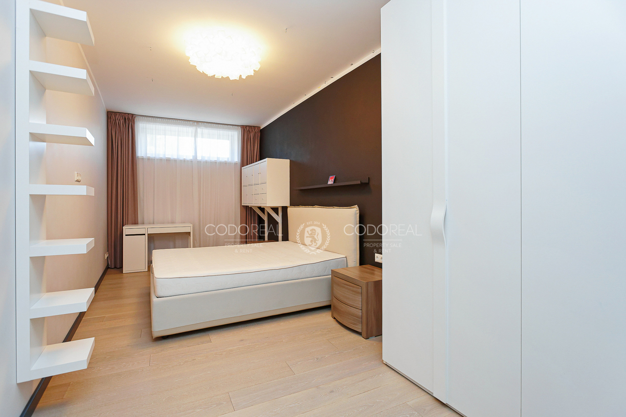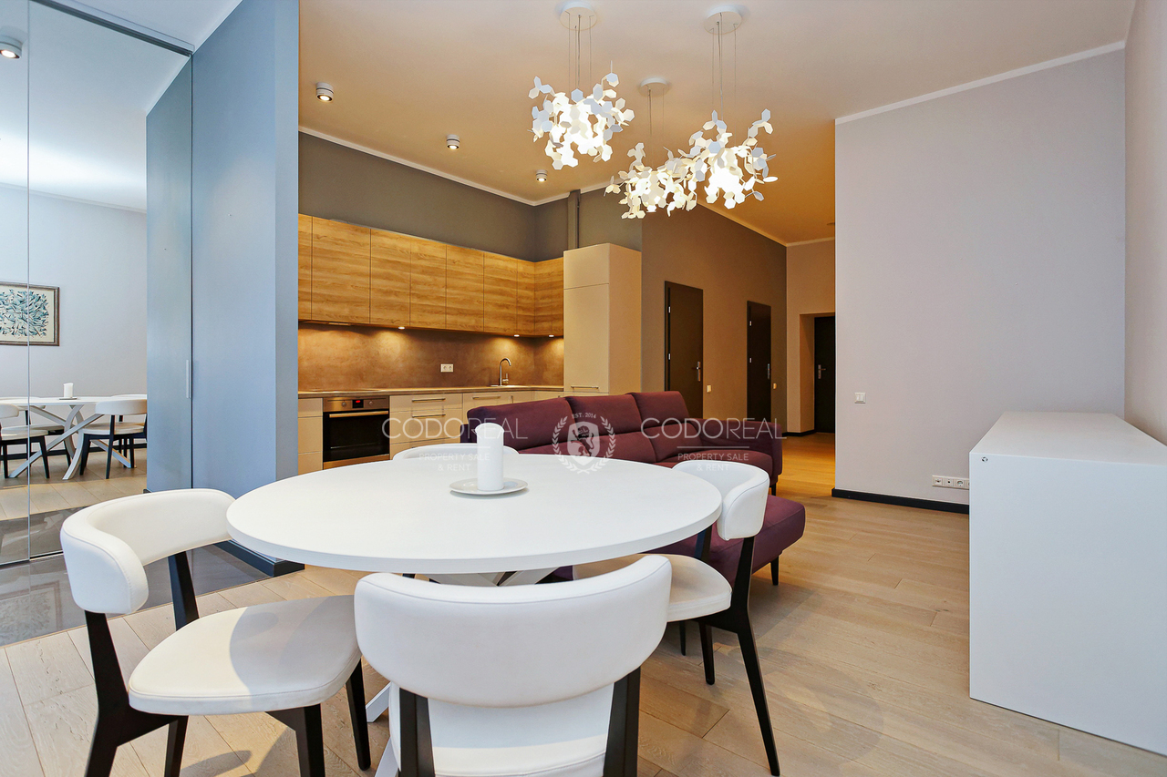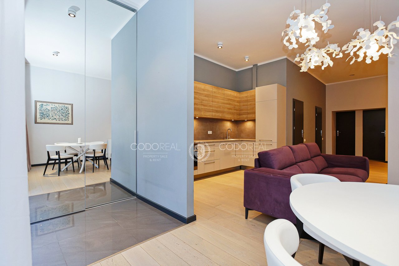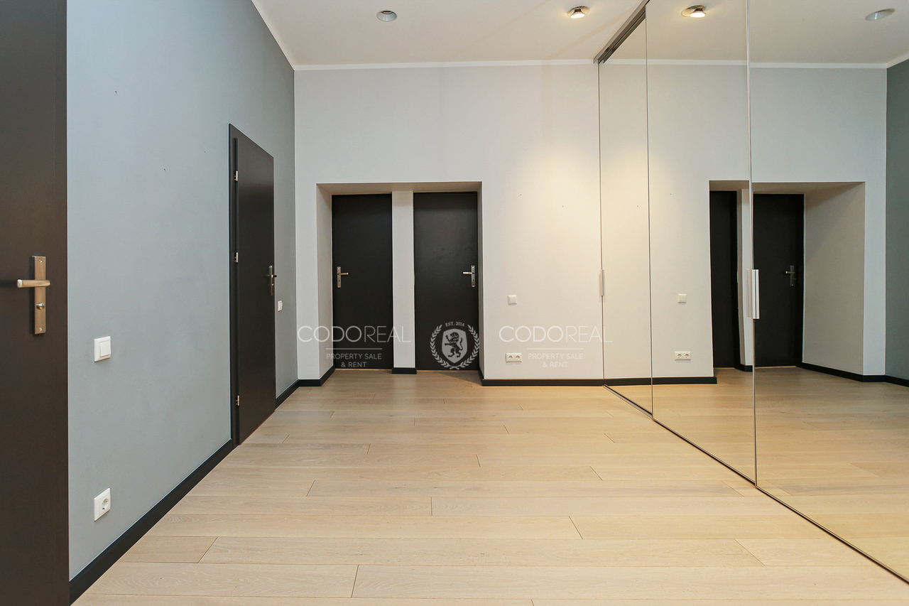 We offer to rent a 3-room apartment in Agenskalns, in the residential complex "Kalnciems Quarter Residences". The apartment is located in a separate one-storey building, with a private entrance and a small outdoor terrace. What makes the apartment special is the interior and layout created by the designer, with his vision of city life. The price will include one surface parking space.