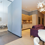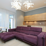 Quality finishing and plumbing, high ceilings, large built-in closets and tasteful kitchen equipment. Spacious living room combined with kitchen area, two separate bedrooms, bathroom with shower and guest WC.