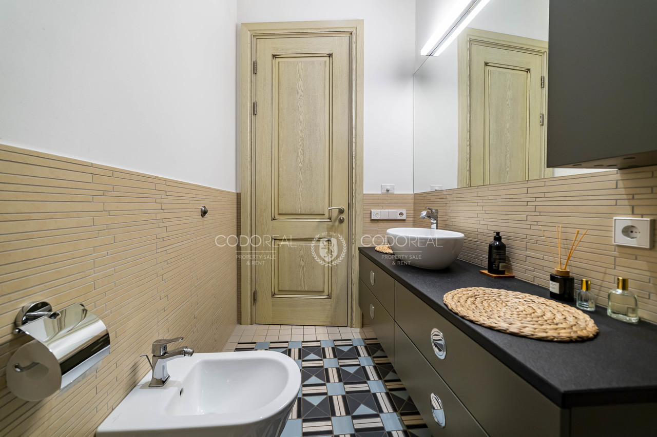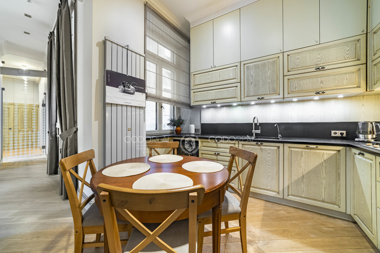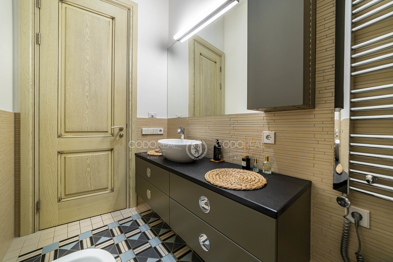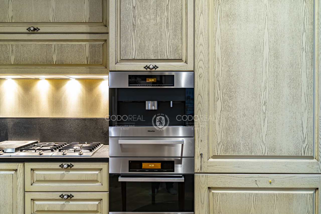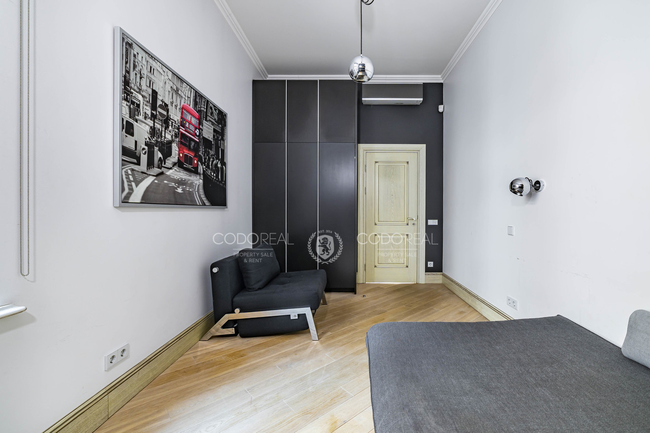 The apartment is fully furnished and equipped, high-quality furniture and household appliances, built-in wardrobes, designer interior, located on the third floor of a renovated building. The built-in recuperation system, individual gas heating, air conditioners, separate storage and utility room will add to the comfort of life.