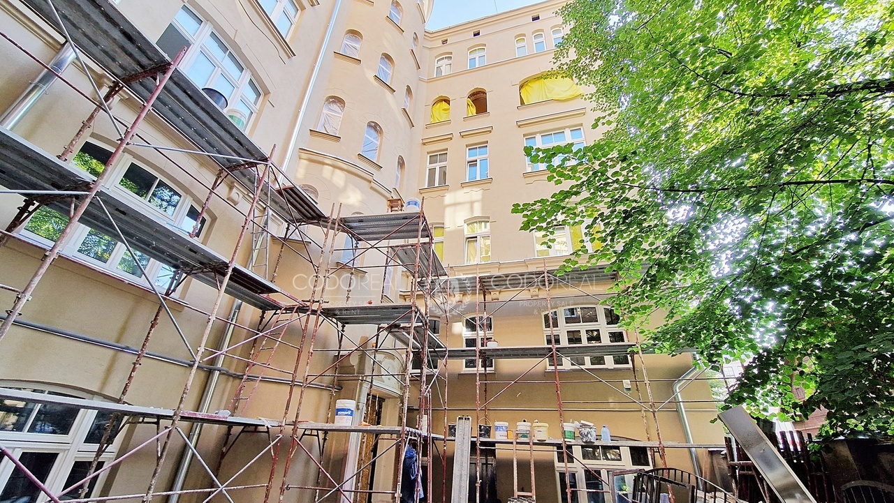 Квартира находится в отреставрированном довоенном кирпичном здании с восстановленными историческими элементами — аутентичные детали лестничной клетки, оригинальная архитектура фасада и ухоженный, благоустроенный внутренний двор.