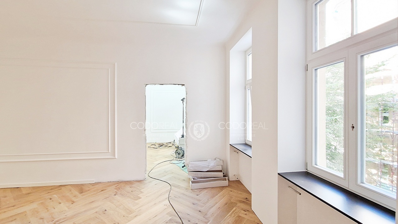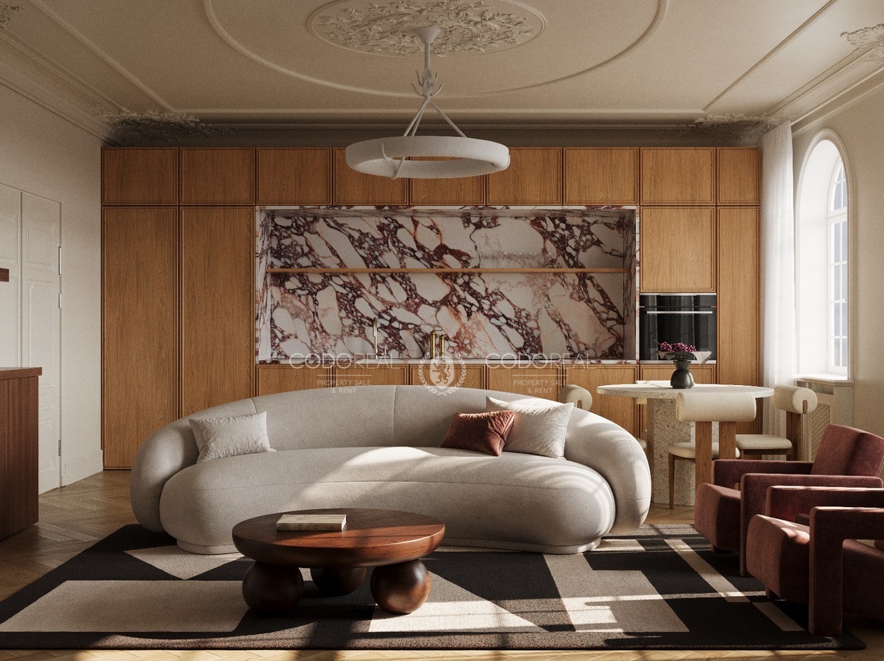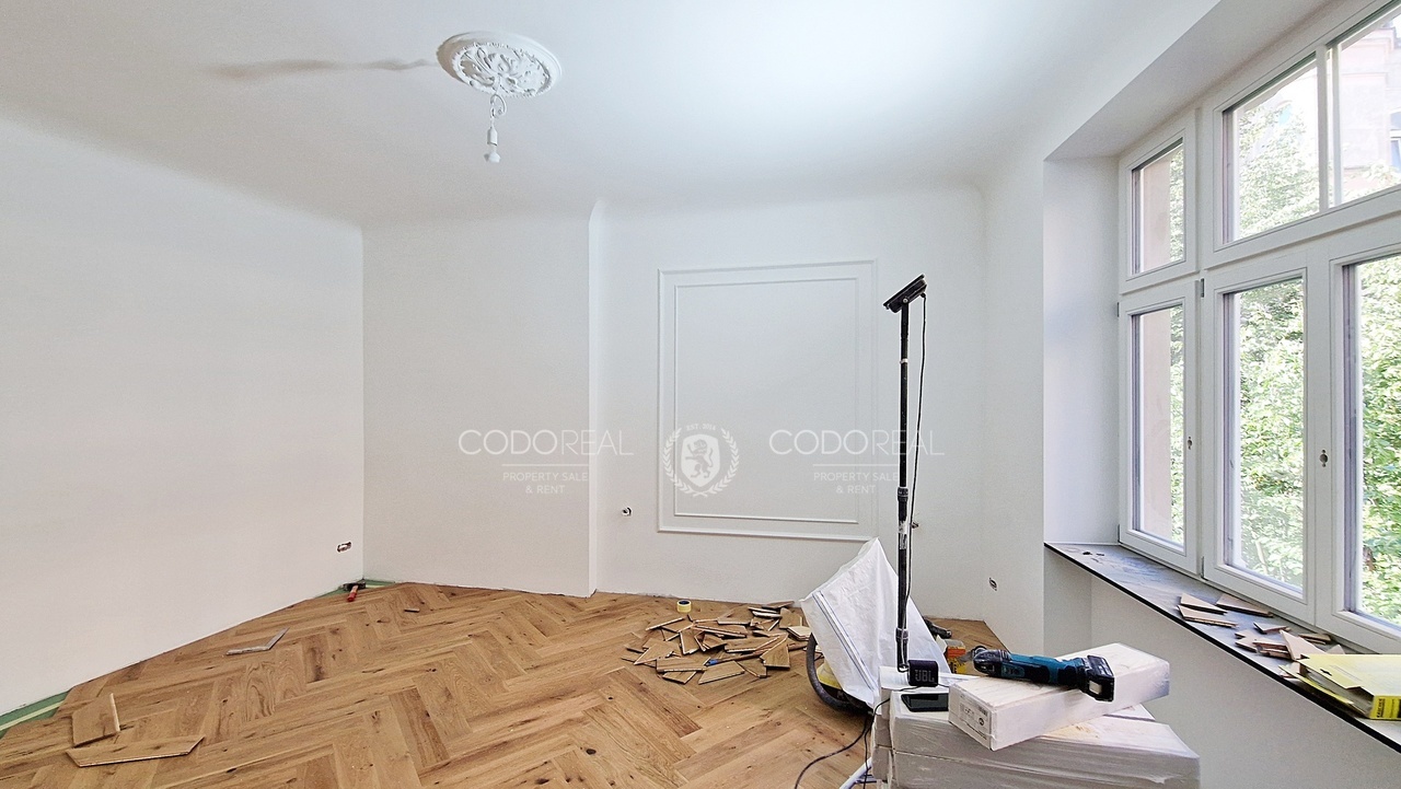 Предлагается возможность приобрести недавно отремонтированную, качественно обновлённую квартиру в самом сердце Риги — в доме, где ощущается дыхание городской истории.