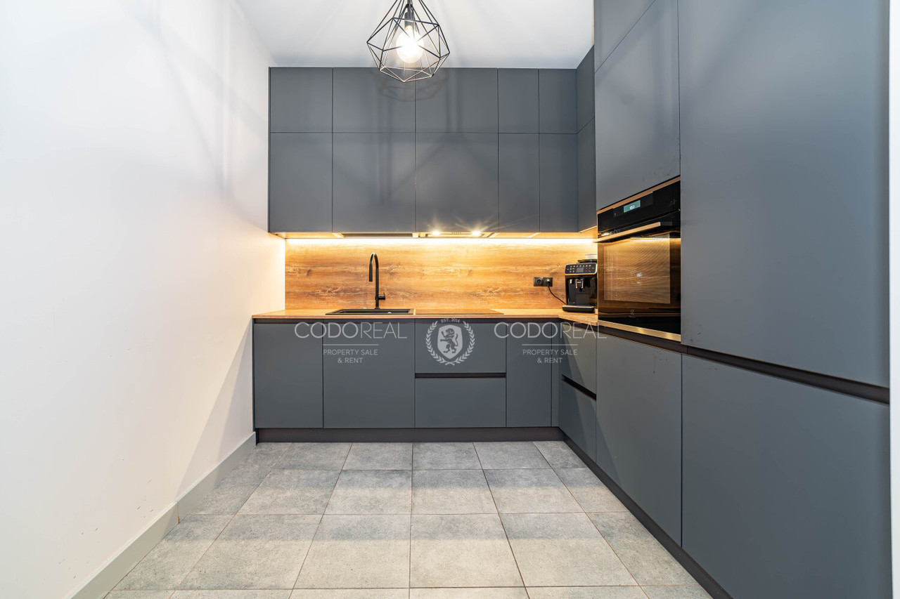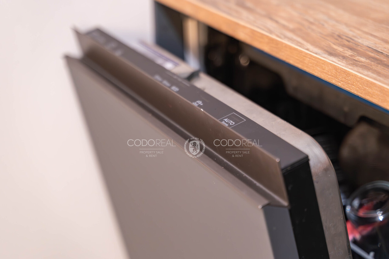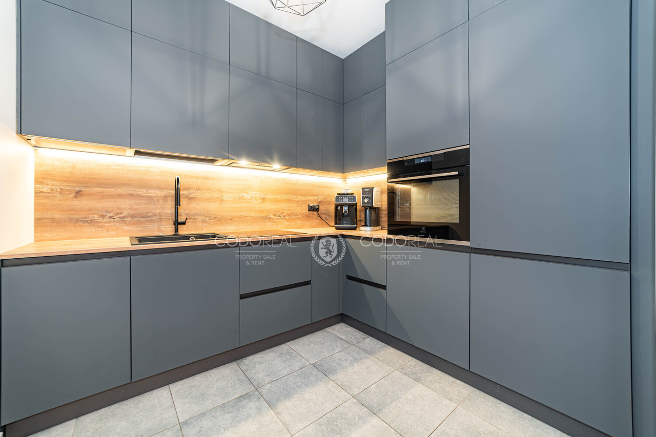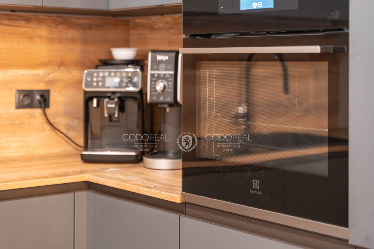 The apartment is sold with a built-in kitchen, wardrobes, lighting fixtures, and household appliances.