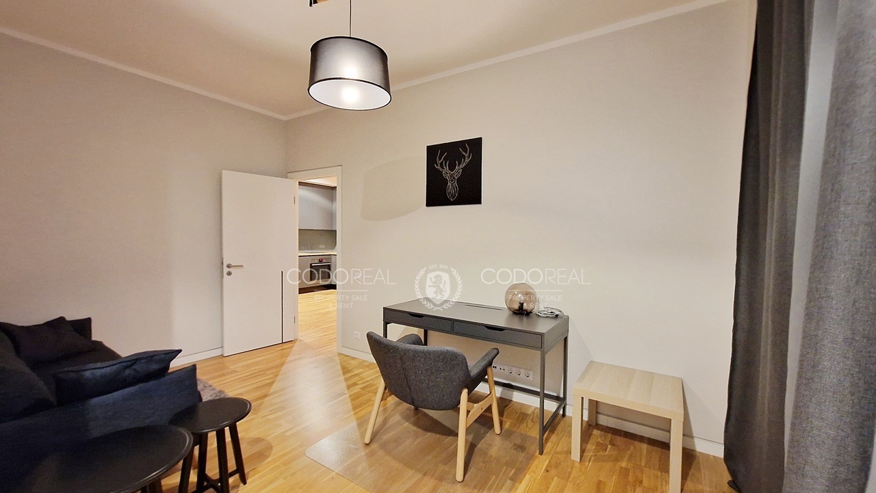 В квартире две отдельные спальни, одна оборудована как кабинет, просторная гостиная, объединённая с кухонной зоной, и два санитарных узла — WC и ванная комната с ванной.